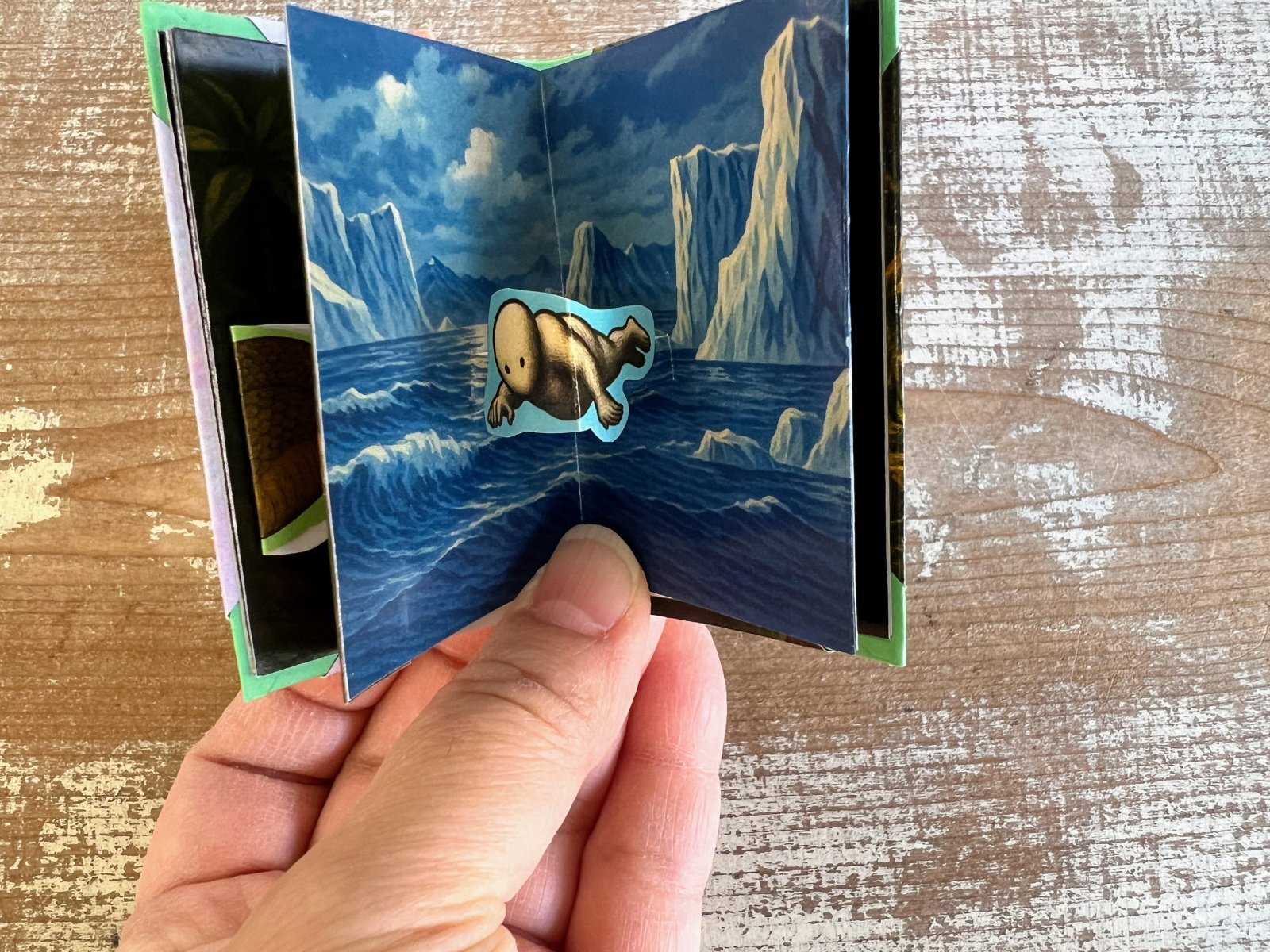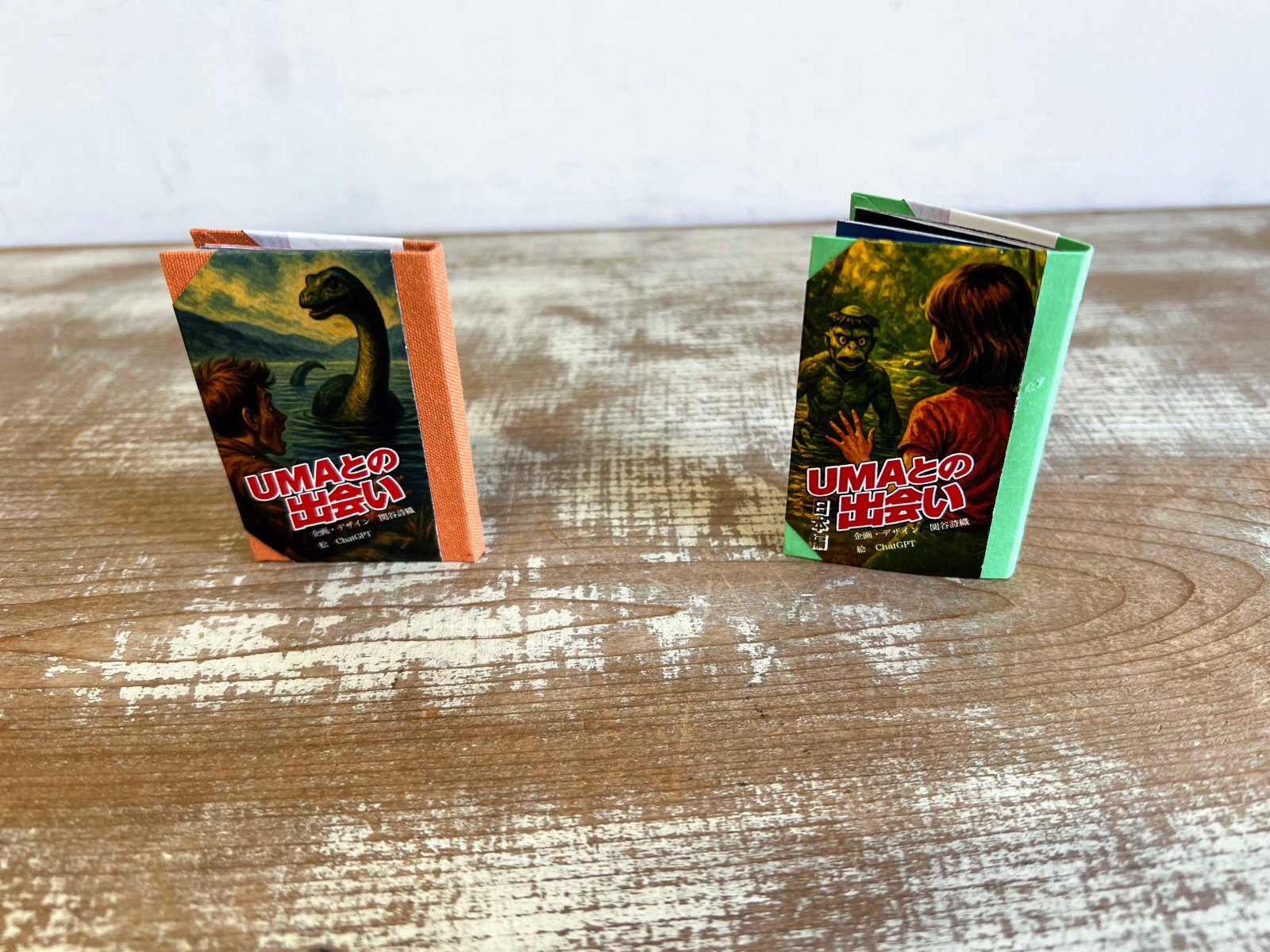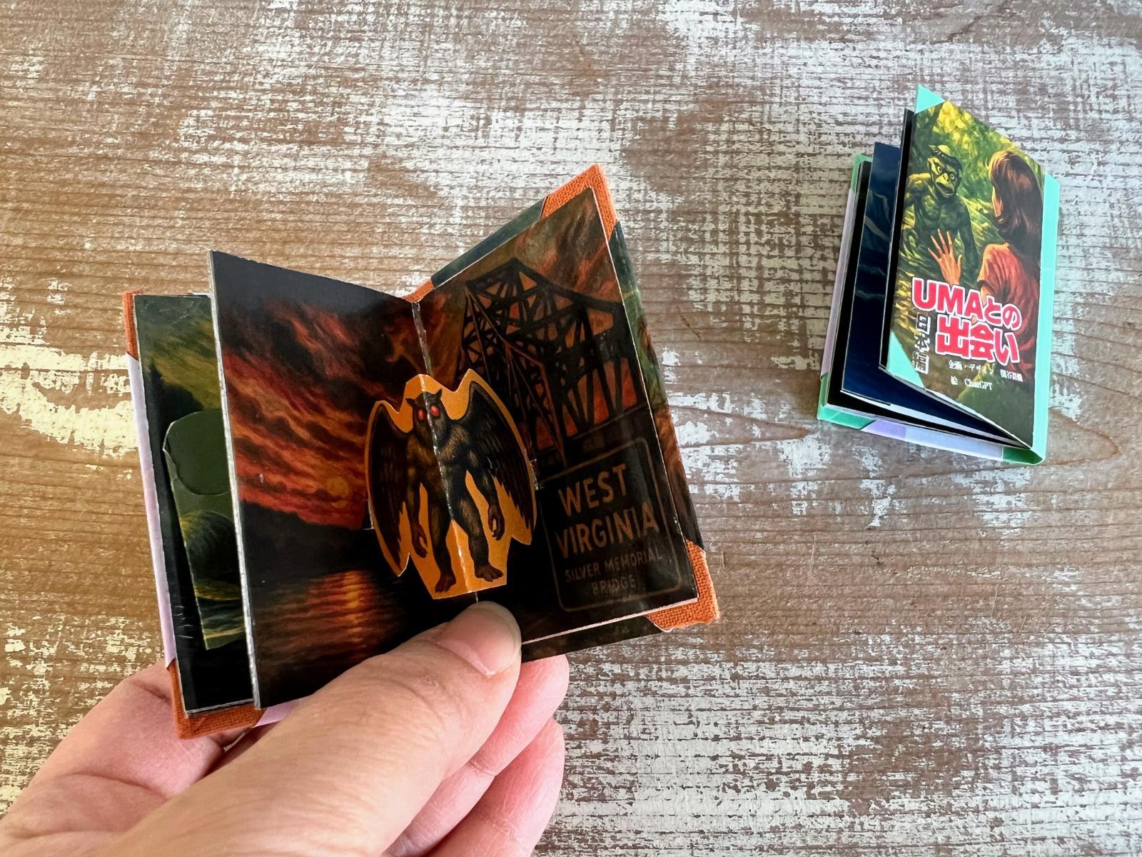 UMAを紹介したポップアップ豆本二種。絵はchatGPTで生成した。UFOステッカー、UMA解説付き