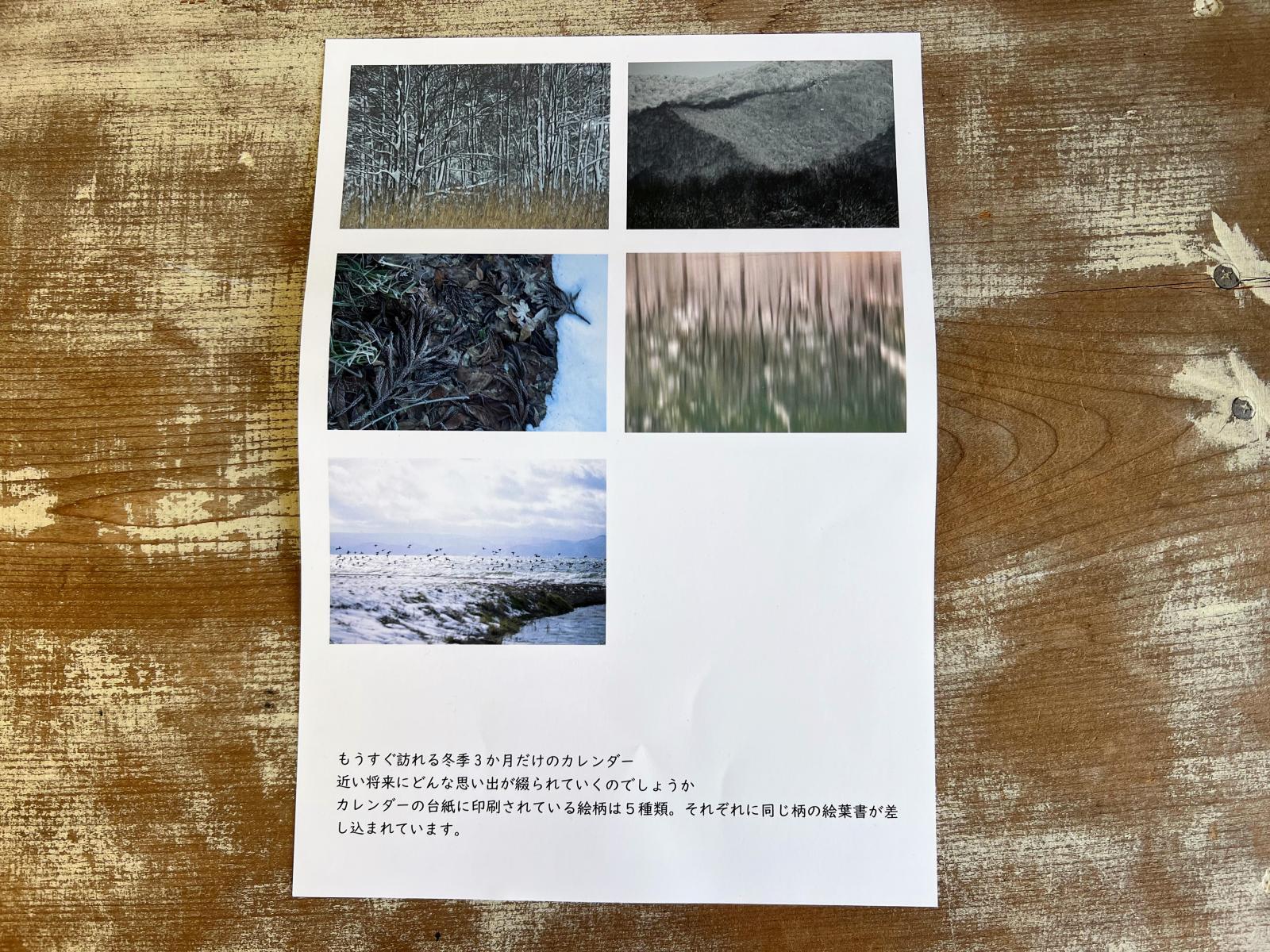 今年の冬にはどんな思い出ができるのでしょう? カレンダーの絵柄は5種類。カレンダー台紙にプリントした写真と同じ写真をプリントした葉書が挟んであります。